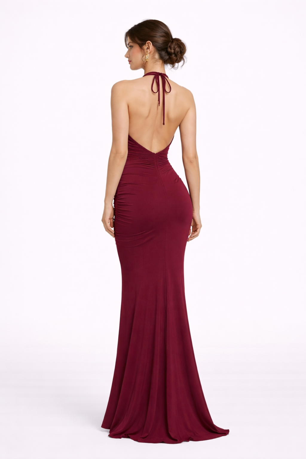 A show-stopping plunge maxi dress with a halter neckline and gathered detailing, designed to sculpt and flatter.