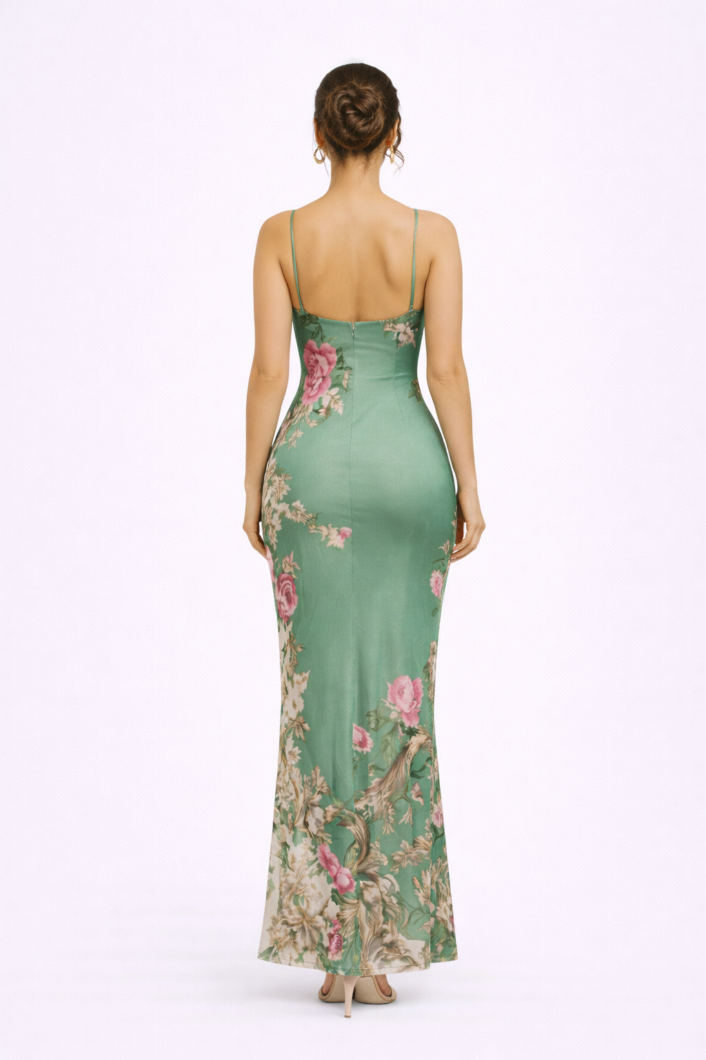 A romantic sage green maxi dress featuring delicate floral detailing and a sleek, body-contouring silhouette. Designed with fine straps and a soft stretch finish for an effortlessly elegant look.